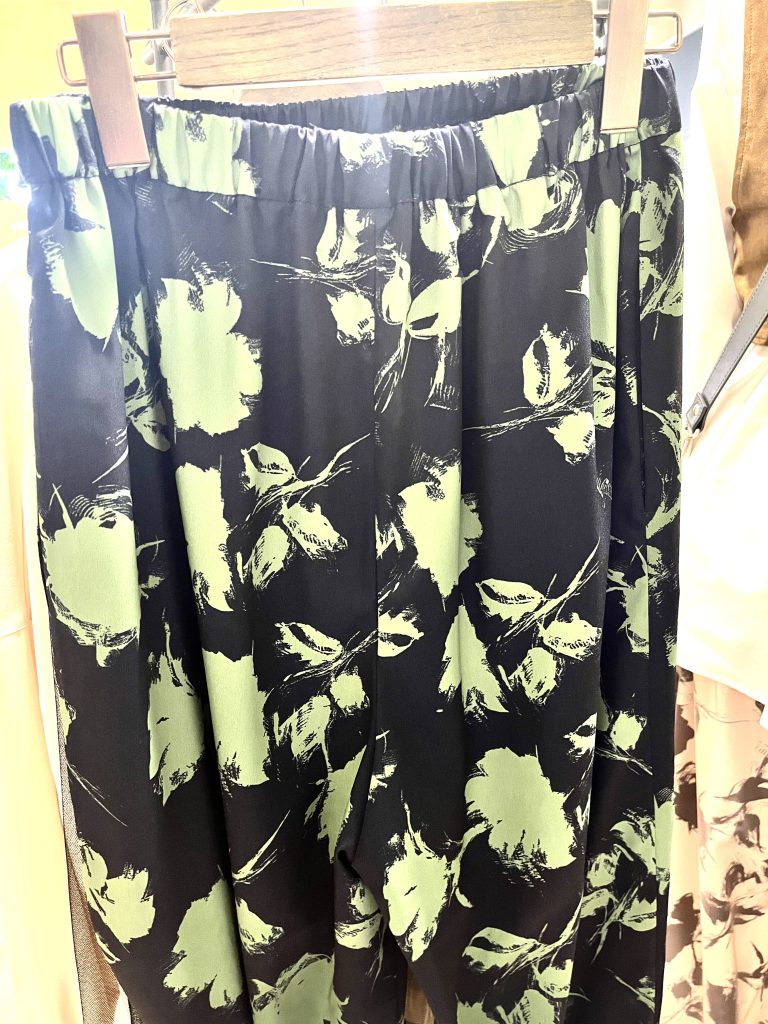 お色違いはネイビーベースのグリーン模様にブラックのチュールパンツです。