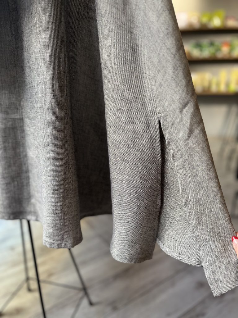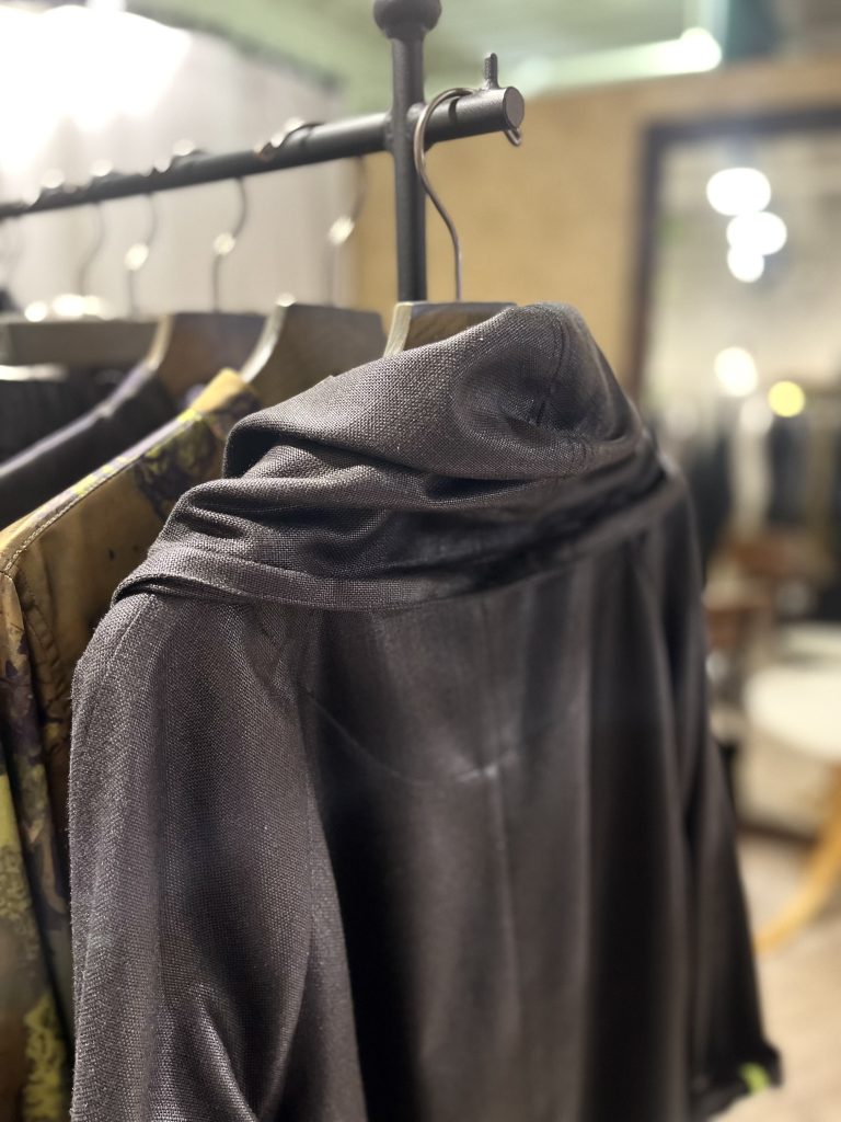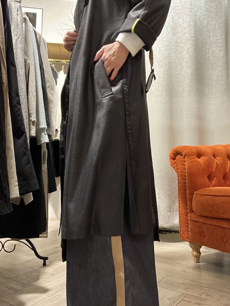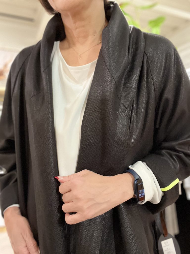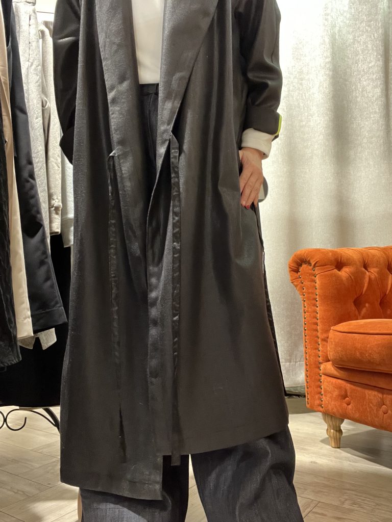 そして光沢のあるフレンチリネンが上品でシンプルなデザインにバランス良く溶け合うロングコート。