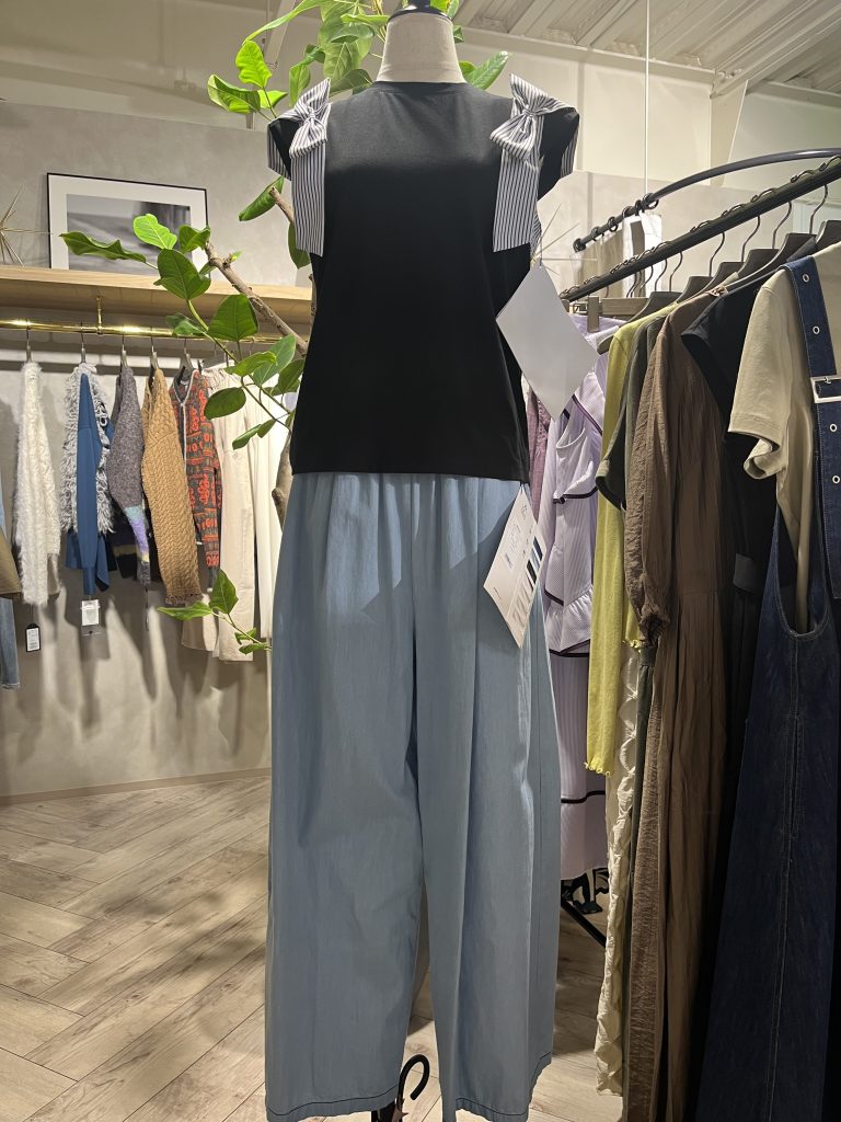 ダンガリーワイドパンツ×袖ストライプリボンプルオーバー。