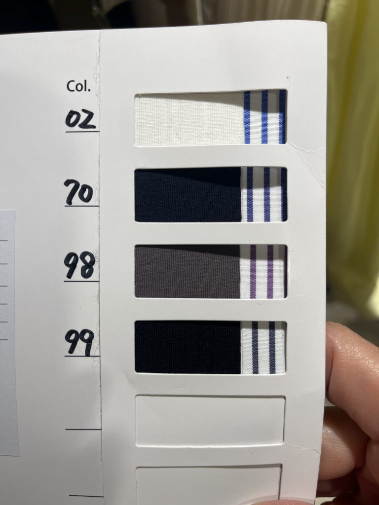 左の無地面が身頃の色でストライプがリボンの色となります。