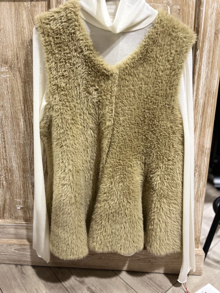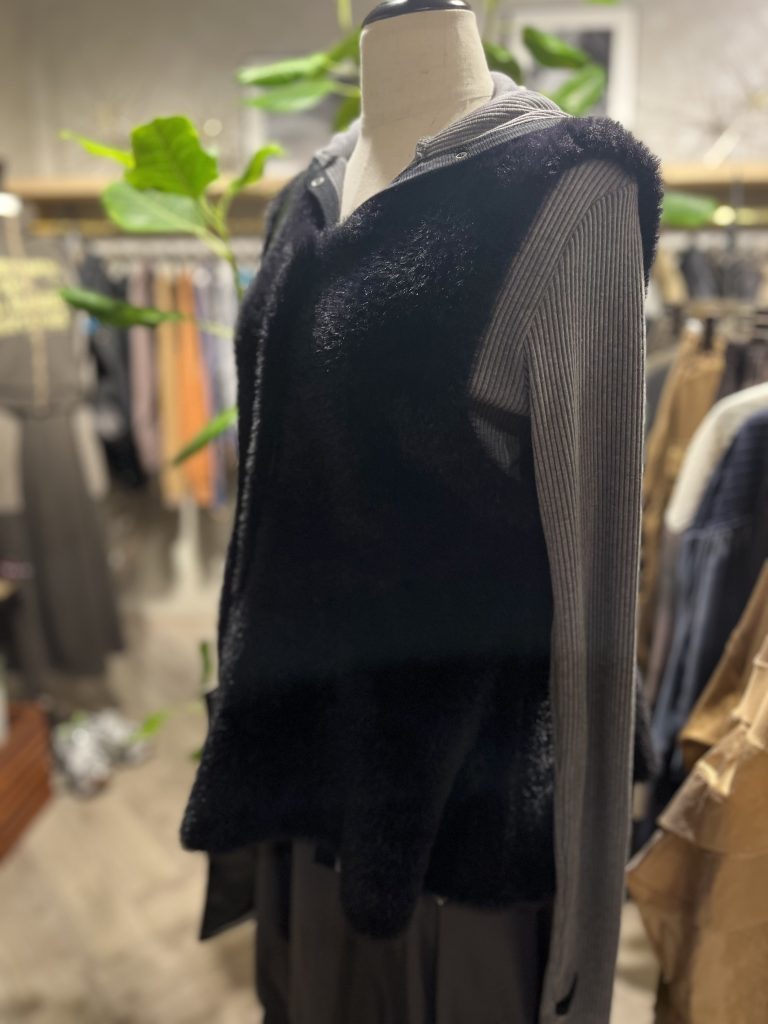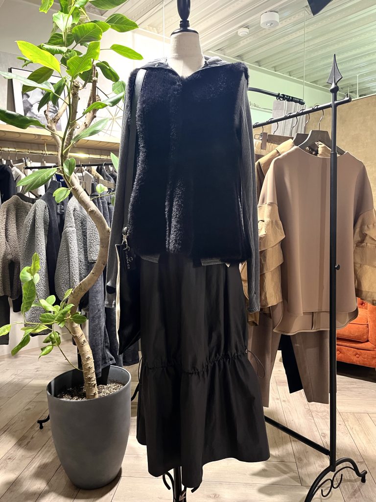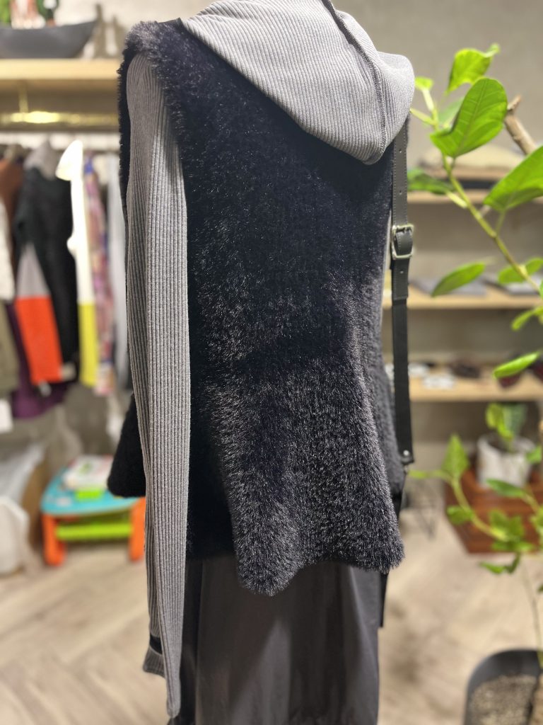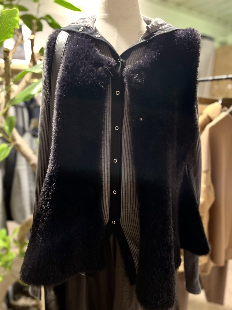 Aラインのフェイクファーベストと前開きにもなるフード付きカットソーを組み合わせてます。