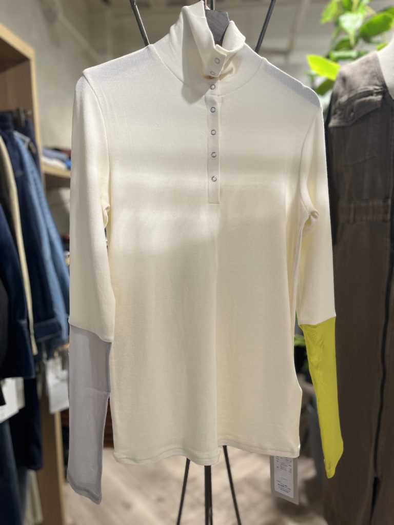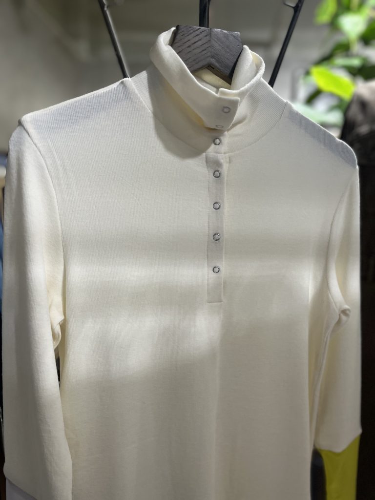 ハイネックにも、、ボタンを開けてスッキリ見せる事も出来る振り幅広めなアイテムなので、1枚あると便利ですよ。