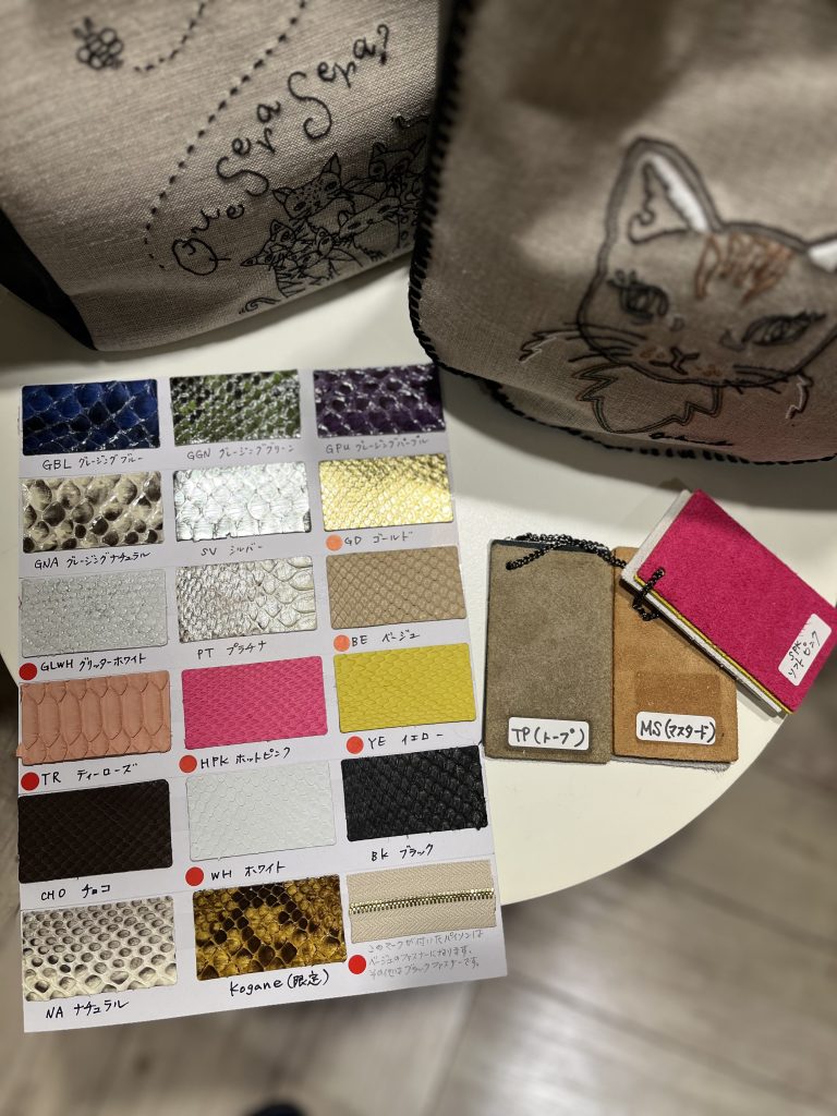 受注アイテムは、店頭に置いてあるレザースワッチでお好きなカラー、刺繍でカスタマイズ出来ます。