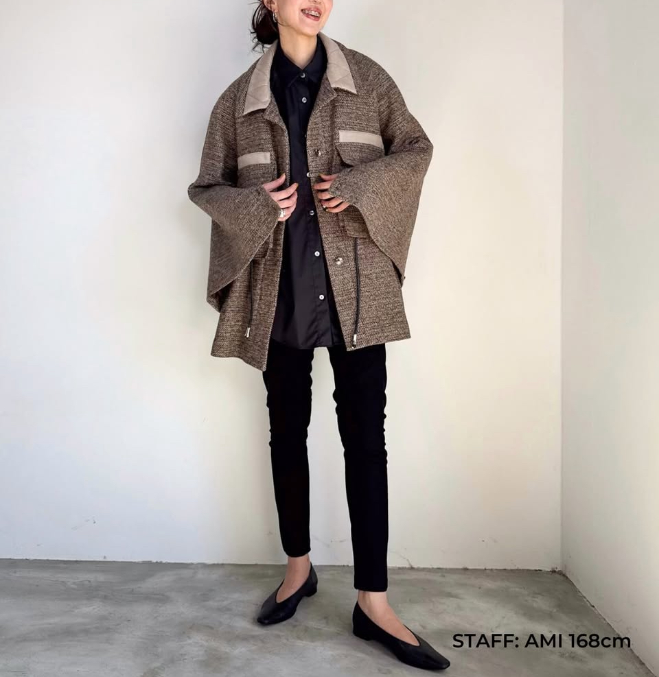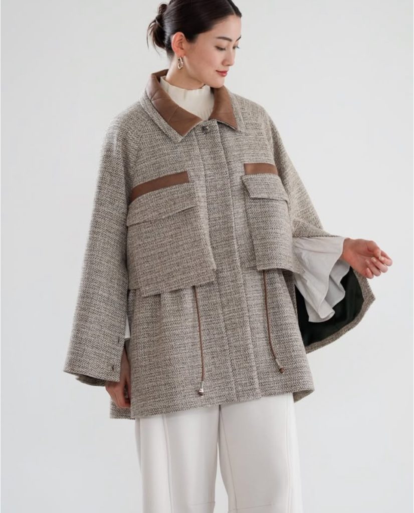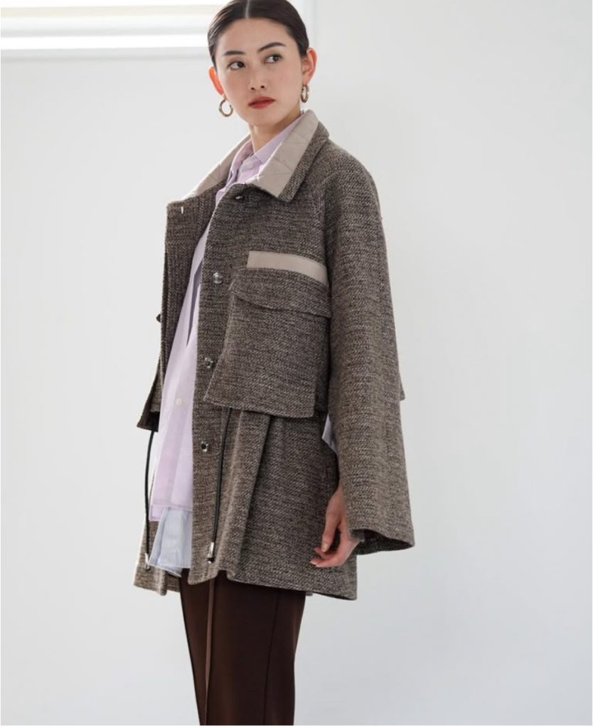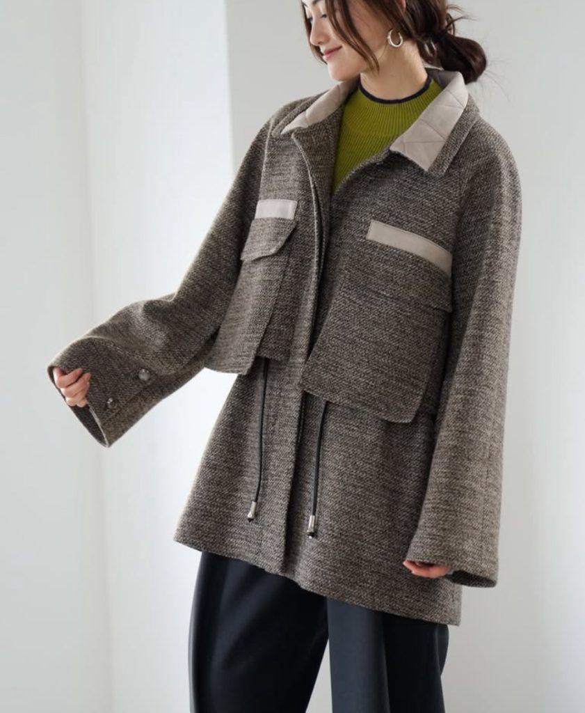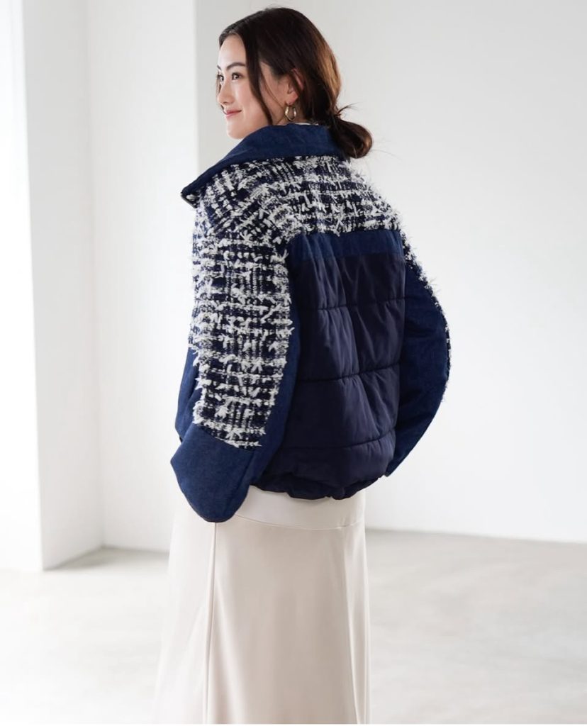 ファンシーツイードとデニムをドッキングした中綿入りのコートジャケット。
