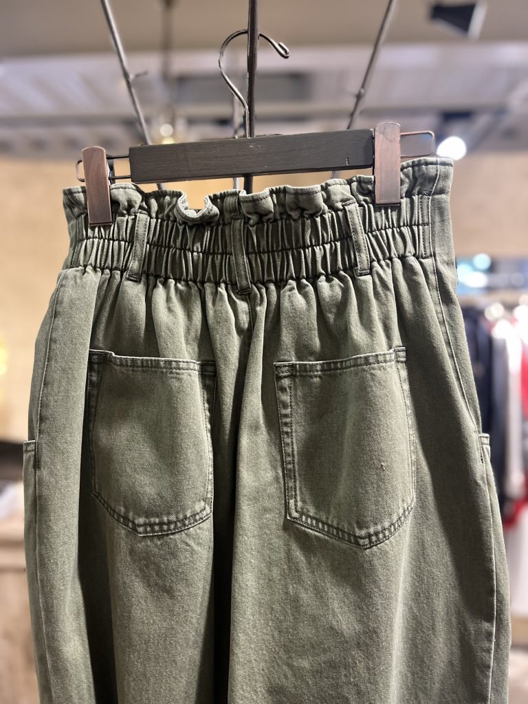 ウエストは前をスッキリ。後ろはゴム+ミニフリルでタックインが映えるタイプです。
