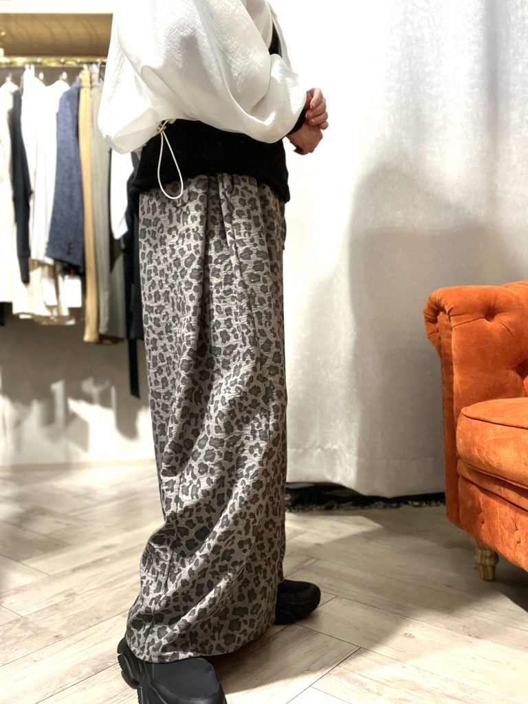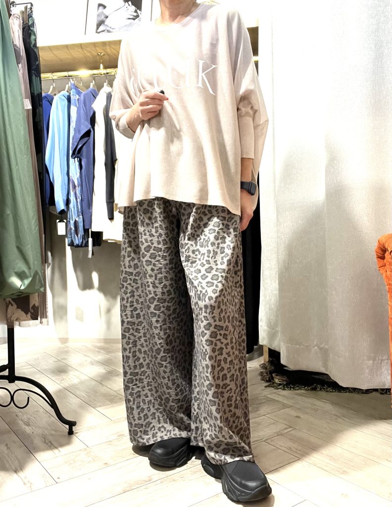 レオパード柄のイージーパンツを軸にしたコーデです。