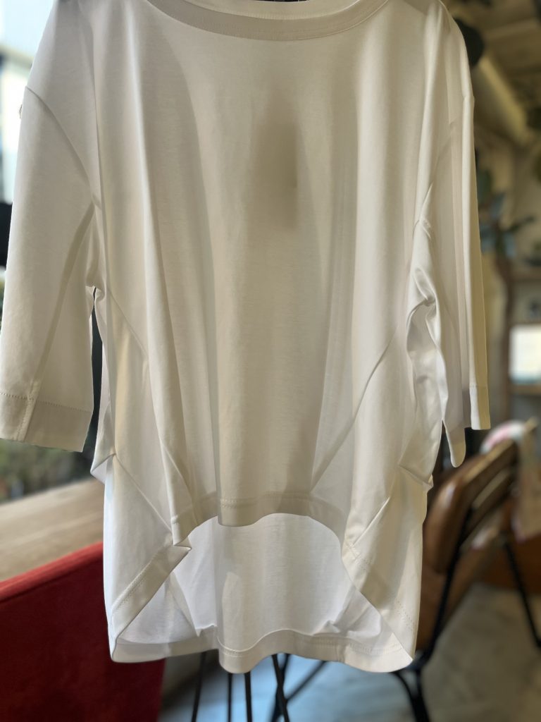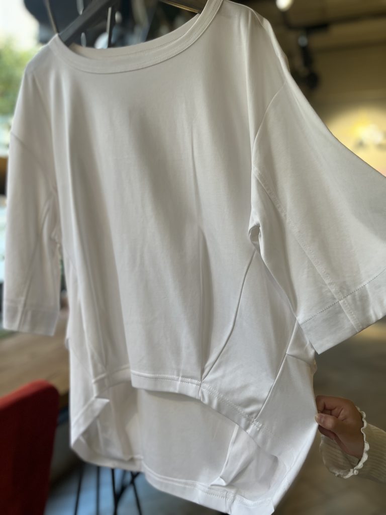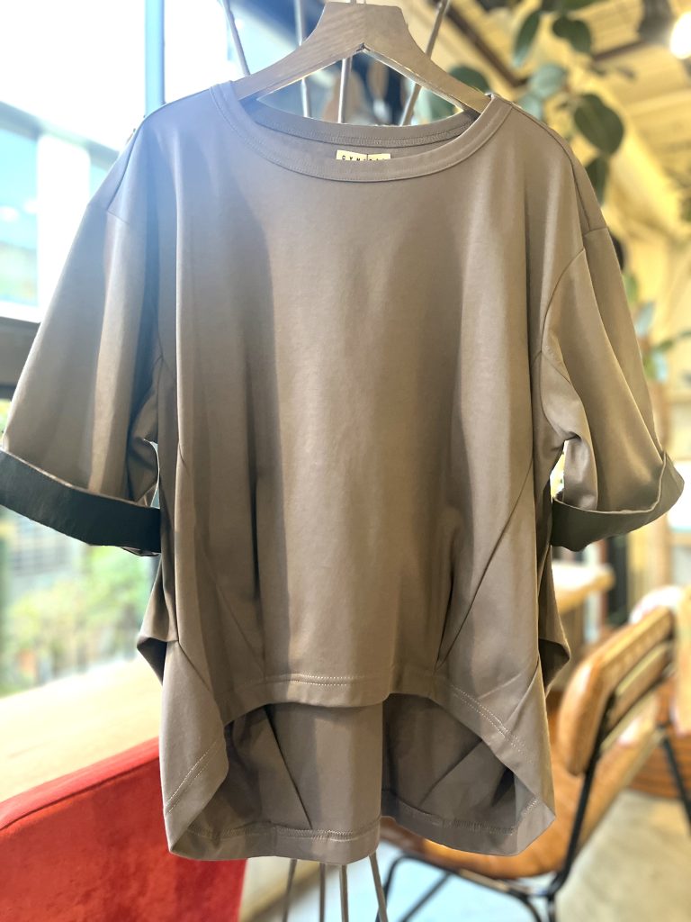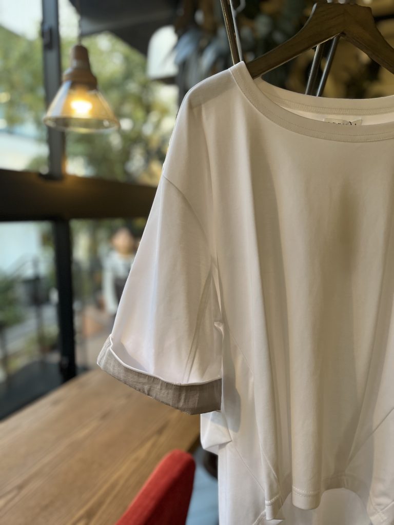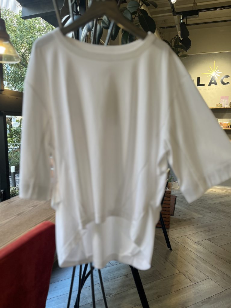 コチラの大胆な前後差が特徴的なTシャツも、シンプルながらテクニックを効かせたタイプ。